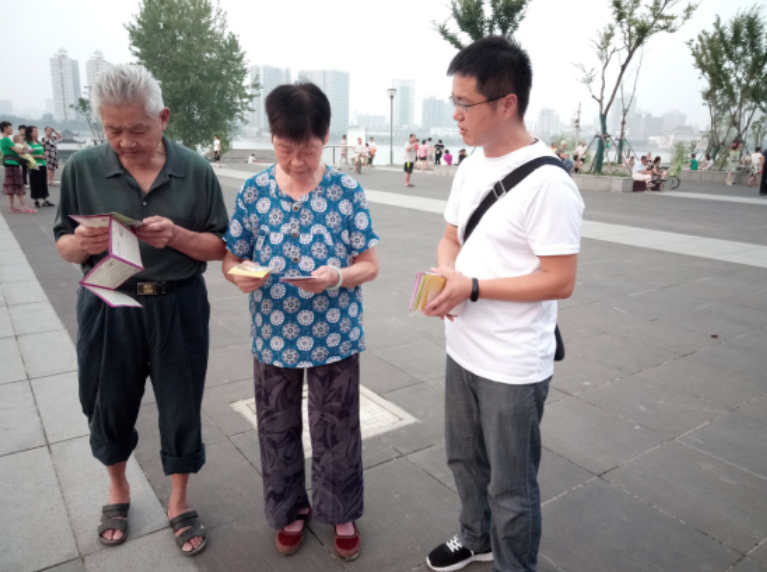 工作人员向群众发放资料、宣传政策