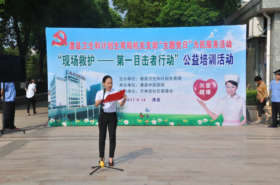 活动现场, 澧县卫计局副局长覃辉为“第一目击者”现场急救主题党日活动致辞。她指出:随着人民群众健康保健意识的不断增强,如何充分利用卫计行业优势,更好的保障广大人民群众生命健康服好务,是我们积极探索的重要课题。举办此次公益活动,是结合卫计行业特点,贯彻落实各级党委加强党的基层组织建设,是为民服务的一项重要举措,更是号召局机关全体党员积极投身公益事业,倡导无私奉献新风尚的具体体现。随后,县中医医院急诊科主任马迎秋带领急救团队为观众从急性气道梗阻、溺水急救、电击伤急救、创伤急救及心肺复苏术等五个方面进行详细讲解和现场示教,并邀请现场观众现学现教,进行互动。急救团队规范、标准、专业的演示,赢得了观众阵阵掌声。