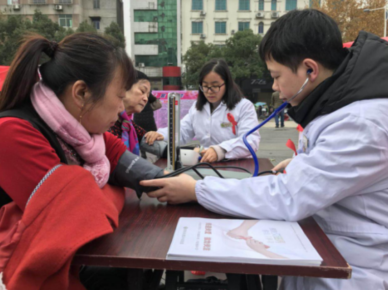 不忘初心深入社区服务于民共享健康生活活动中,医务人员详细向群众讲解了艾滋病的传播途径、预防措施与艾滋患者接触的注意事项等艾滋病相关知识,发放艾滋病防治宣传手册和免费安全套,并免费测量血压。