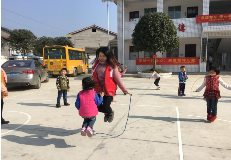 在学校,志愿者们为该校的孩子们送去了爱心和温暖,讲述了勤学励志故事,与孩子们一起唱歌、跳绳、做游戏,并向这些留守儿童赠送了书包、书籍等100多件文具用品。