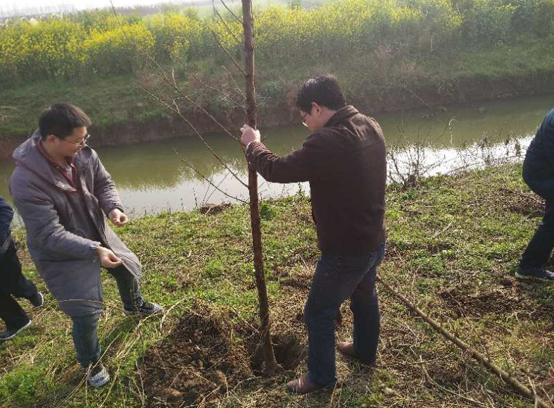植树现场我们按照西洞庭管理区公路局的种植要求,在种植地作下了标记的地方挖一个30厘米深的坑后,将树苗放置其中,然后挥舞铁铲将周围的泥士边填满碾压边扶直竖正。给树苗施上水才算将一棵幼苗种植完成了。大家个个热情高涨,干劲十足,在林场专业技术人员的指导下,合力在两个小时的时间里便完成了800株幼苗的种植。