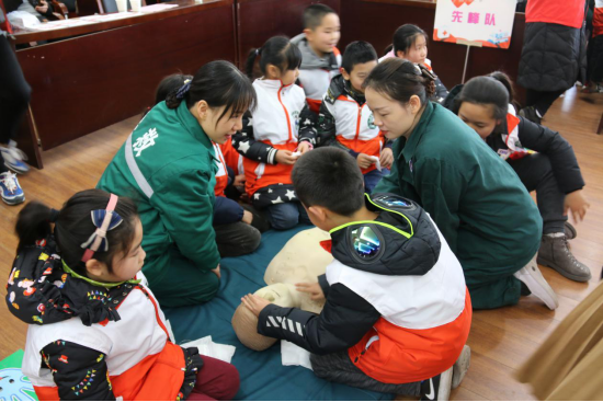 培训中,急救培训师们通过趣味动画、视频演示、提问互动等方式,向小学员们讲解了救护新概念和急救知识。手术室护士长欧阳华莉为学员们现场演示了正确的七步洗手法,骨伤二科徐平医生为学员们讲解了外伤止血、包扎、搬运等知识,中医医院重症监护室副主任谭志鹏带领学员们一起学习了心肺复苏术、气道异物梗阻急救技能。现场还有志愿者们配合授课讲师现场为学员演示心肺复苏术、外伤包扎等授课内容,并一一指导学员们进行模拟练习。讲师们还通过提问、操作比武等方式对参训学员进行了急救知识考核,并为通过考核的学员颁发急救培训证书,还为考核成绩优异的小学员颁发了奖品。