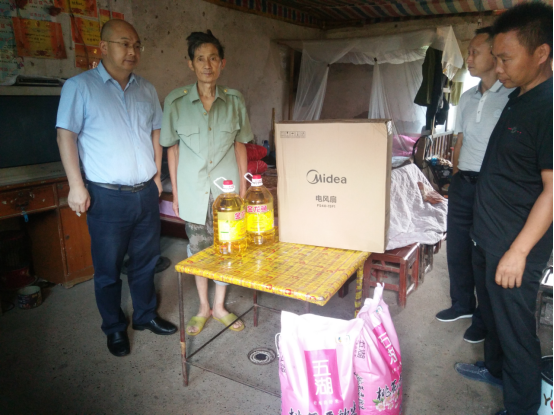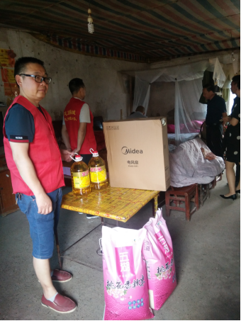 鼎城区疾控中心积极响应常德市文明办在文明常德微信平台上发布的“认领微心愿,争当圆梦人”的号召,在消息发布后的当天便与郑圣忠所在的乡镇联系,明确微心愿内容,一把手蔡政云书记亲自负责,全程参与。在郑圣忠家,志愿者们了解到郑圣忠原是鼎城区韩公渡镇郑家河村一名乡村医生,行医认真负责,曾多次获得乡镇“优秀共产党员”称号。前些年妻子因病去世后,自己也患上了癌症,常年卧床养病,导致家境贫困。蔡书记一边翻看郑圣忠的病例,一边对他说:“现在国家政策好,医疗水平也很高,你一定要有战胜疾病的信心。医者仁心,你救治了那么多人,相信好人有好报!”随即又从自己的口袋中取出五百元现金放在了老郑手中。郑圣忠握住蔡书记的手,连声感谢,“没想到,为了满足我一个小小的心愿,大家在这么炎热的天气来看我,为我送上所需物资。感谢你们!”