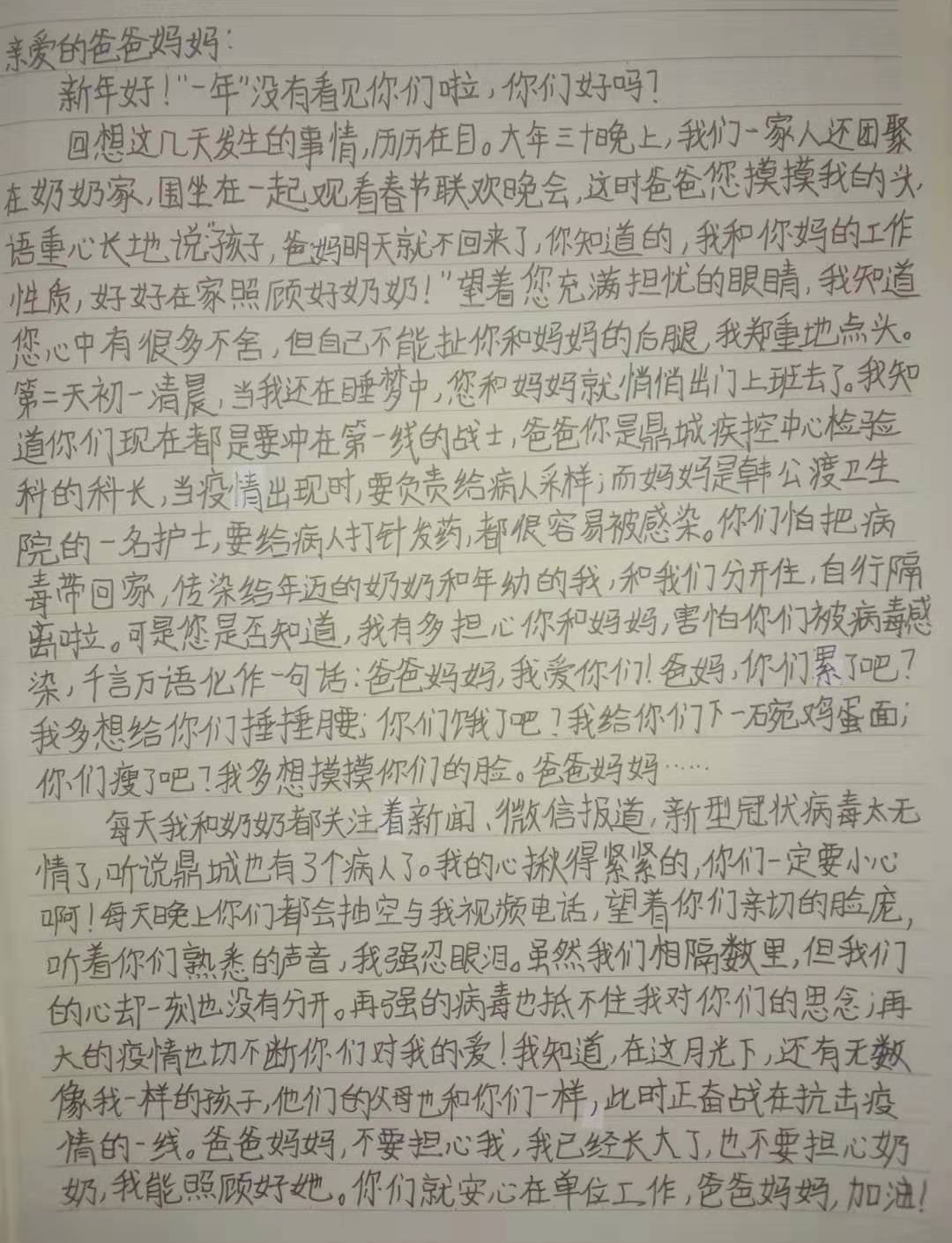 这是13的儿子李佳泽写给父母的家书,他的爸爸李明,是鼎城区疾控中心检验科科长。妈妈赵丹丹,是韩公渡卫生院的一名护士。春节前夕,一场突如其来的疫情席卷祖国大地,全国上下近已千万的白衣战士投入到这场没有硝烟的战斗中来,爸爸负责辖区内疑似病人的标本采样及报送,妈妈负责为病人打针服药,都是很容易被新型冠状病毒感染的高危职业。为了家人的健康,从大年初一便主动与他们隔离。孩子看在眼里,思念埋在心里,他说:我想给爸爸妈妈写一封信,告诉他们,我和奶奶一切都好,不要惦记我们。记住保护好自己,等到春天,山花烂漫时,我们再相聚!爸爸妈妈,加油!所有抗击疫情的白衣天使们,加油!