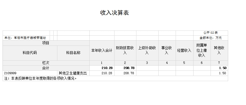 2024年度收入合计210.28万元,其中:财政拨款收入208.78万元,占99.29%;上级补助收入0万元,占0%;事业收入0万元,占0%;经营收入0万元,占0%;附属单位上缴收入0万元,占0%;其他收入1.5万元,占0.71%。