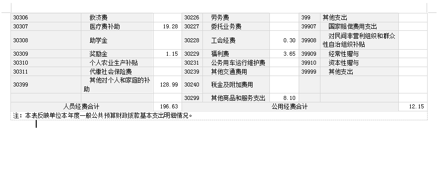 人员经费196.63万元,占基本支出的94.18%,主要包括基本工资21.67万、津贴补贴2.02万、绩效工资7.30万、机关事业单位基本养老保险缴费5.33万、职工基本医疗保险缴费2.83万、职业年金缴费2.67万、医疗费1.5万、抚恤金3.89万、医疗费补助19.28万、奖励金1.15万、其他对个人和家庭的补助128.99万。